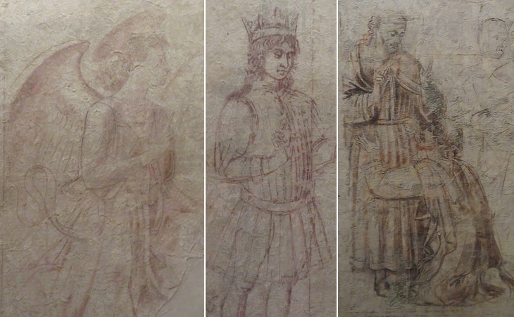Museo delle Sinopie: preparatory drawings by Benozzo Gozzoli: (left) angel of the Annunciation; (centre) one of the Magi (see The Magi (the retinue of Emperor John VIII), his masterpiece in Florence (it opens in another window) and another of his paintings at Musei Vaticani; (right) the Marriage of Isaac and Rebekah: Abraham sending forth Eleazar