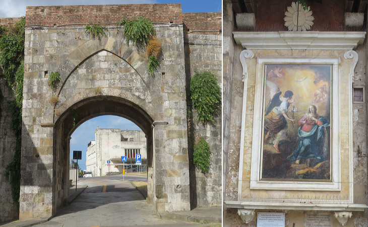 (left) Porta a Mare or Degazia or Legazia (XIVth century) on the opposite side of the river near S. Paolo a Ripa; (right) XVIIIth century Altare dei Navicellari, the guild of the seamen who navigated along the canal between Pisa and Leghorn