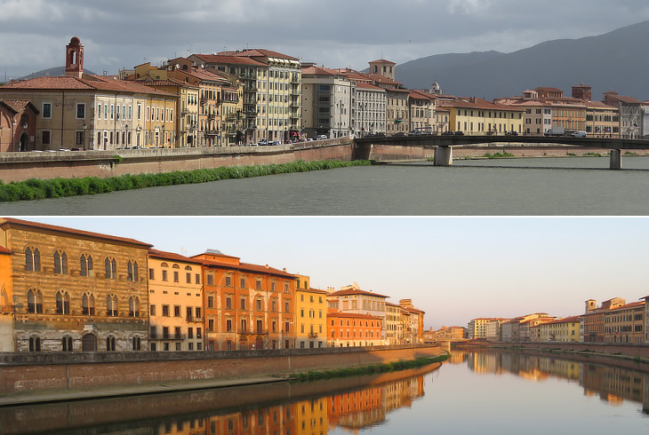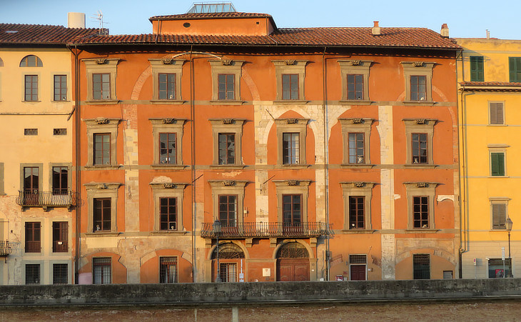 I found the simple large pacified felicity of such an afternoon aspect as that of the Lung' Arno, taken up or down its course. (..) The Pisan Lung' Arno is shorter and less featured and framed than the Florentine, but it has the fine accent of a marked curve and is quite as bravely Tuscan; witness the type of river-fronting palace which, in half-a-dozen massive specimens, the last word of the anciently "handsome," are of the essence of the physiognomy of the place. In the glow of which retrospective admission I ask myself how I came, under my first flush, to fail of justice to so much proud domestic architecture.