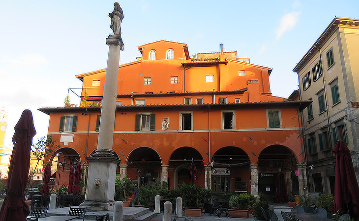 Piazza Cairoli: (left) coats of arms of Cosimo I de' Medici and his wife Eleanor of Toledo (daughter of Pedro Alvarez de Toledo, viceroy of Naples) inside the Collar of the Golden Fleece; (centre) statue of Dovizia; (right) modernized XIIth century building at the eastern side of the square