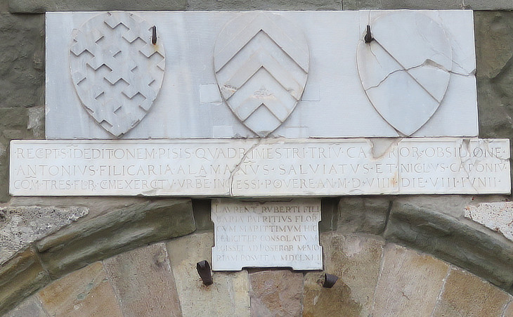 Palazzo Gambacorti: inscription celebrating the surrender of Pisa in June 1509 with the coats of arms of Alamanno Salviati, Antonio da Filicaja and Niccolò Capponi, the commanders of the Florentine armies