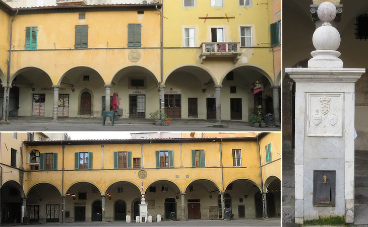 (left) Two sides of Piazza delle Vettovaglie (Provisions) in Terziere Santa Maria; (right) 1715 fountain with a Medici coat of arms which is shown in the image used as background for this page