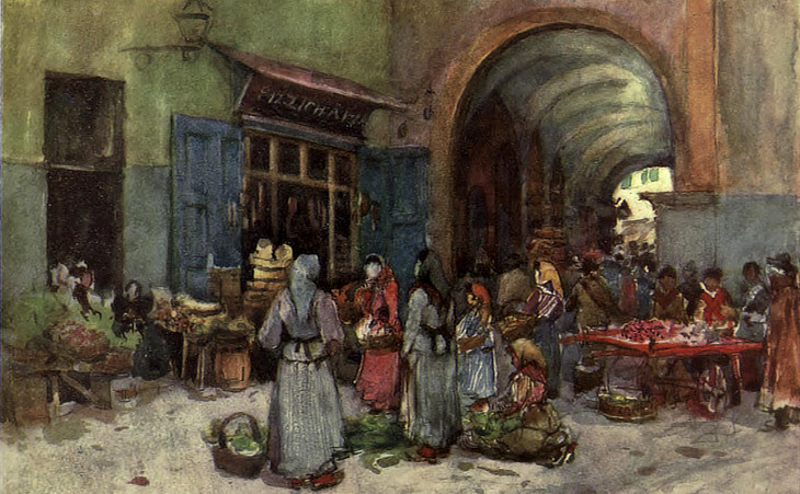 An everyday market scene at Pisa, where countrywomen, having no fixed market stalls, stand selling their wares. (..) Beyond the Piazza dei Cavalieri stretches a maze of picturesque old streets, some colonnaded, and in the centre of these is the old market-place, which might once have been a cloister. It makes a charming picture, the long stalls piled up with fruit and vegetables striking a fine note of colour within the shade cast by the deep and vaulted arches.