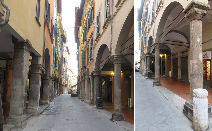 The term borgo usually designates a neighbourhood outside the walls. Its use at Pisa for the central axis of the northern part of the town is explained by the fact that until the XIIth century the Terziere di S. Francesco was not included in the walls and was called Foriporta. Because of its central position in the enlarged town Borgo soon became a very commercial area where shops and taverns were opened. The columns which supported the porticoes were made of timber and the buildings were not aligned.