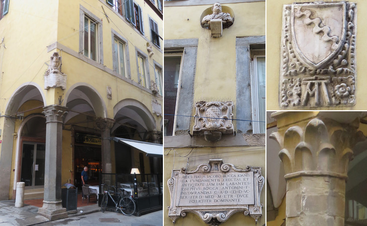 Palazzo Bocca in Borgo Stretto: (left) corner with an inscription indicating that Vincenzo Galilei, father of Galileo, lived in an apartment of the building; (centre) 1595 inscription celebrating the renovation of the palace by the Bocca at the time of Grand Duke Ferdinand I, whose bust is placed above a coat of arms of the Della Seta who inherited the property; (right) coat of arms of the Bocca, similar to that of the Caetani and a lotus leave capital of the portico