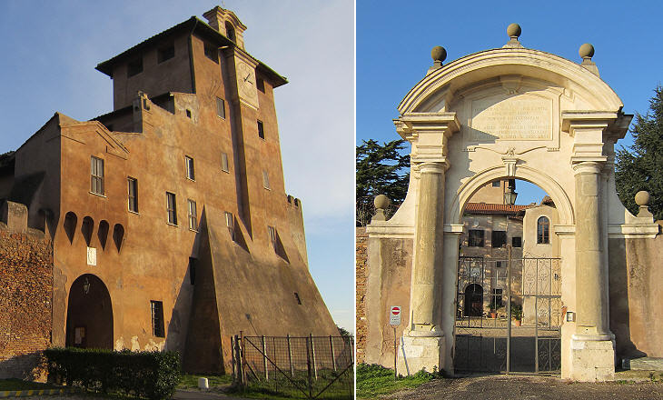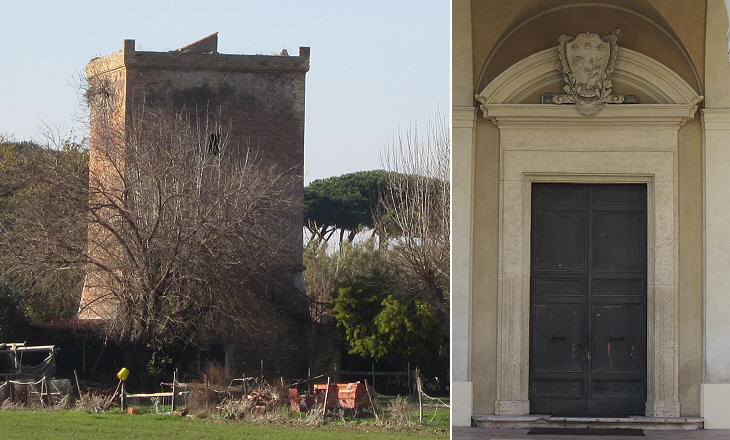 (left) Torre Nicolina; (right) portal of Chiesa del Crocifisso with the coat of arms of Pope Pius VI