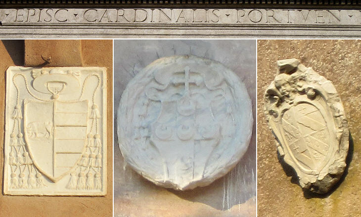 (above) Inscription at S. Caterina dei Funari placed by Cardinal Federico Cesi, Bishop of Porto; (below from left to right): coats of arms of Cardinals Rodrigo Borgia (Pope Alexander VI), Francesco Todeschini Piccolomini (Pope Pius III),
