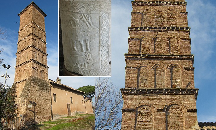 Bell tower of S. Ippolito: (inset) Museo dell'Alto Medioevo: detail of a medieval well found at Porto