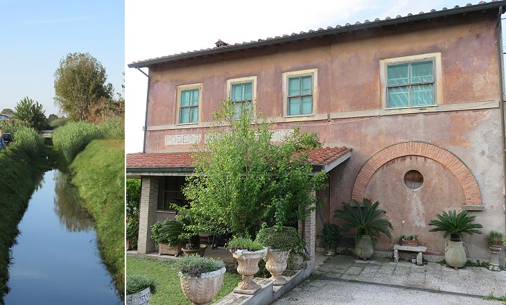 (left) Canale Traianello, a canal which was dug to drain the water from Isola Sacra; (right) a 1930s "podere" (small farm) near the Great Necropolis