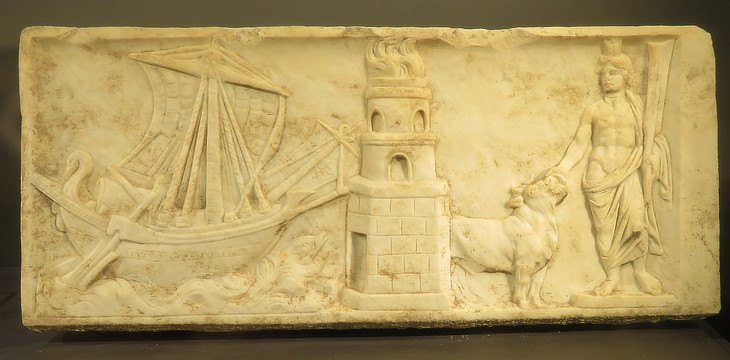 Museo delle Navi di Fiumicino: marble relief depicting a lighthouse and a personification of Porto from the Great Necropolis (IInd or early IIIrd century AD); the image used as background for this page shows the lighthouse in a floor mosaic at the Great Necropolis of Porto