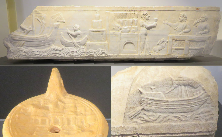 Museo delle Navi di Fiumicino: (above) relief depicting a seaman reaching the harbour and a scene inside a tavern; (below-left) oil lamp with a depiction of Portus; (below-right) fragment of the lid of a sarcophagus