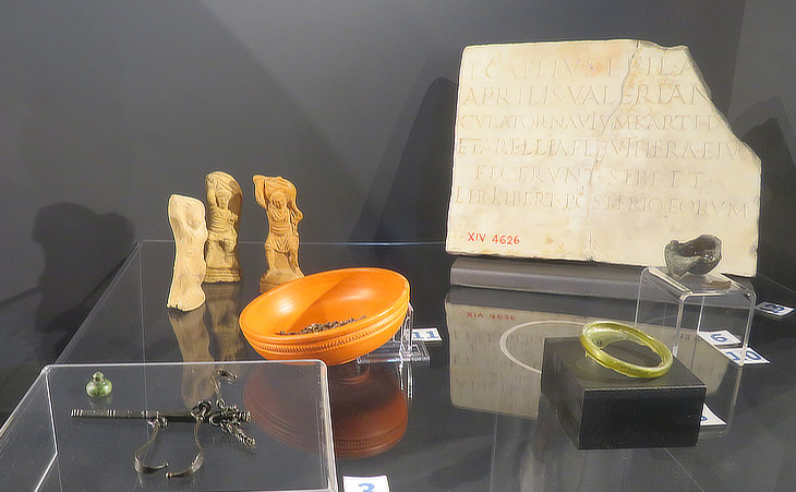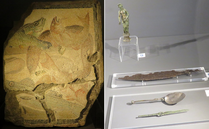 Museo delle Navi di Fiumicino: (left) mosaic with fish, from Isola Sacra; (right) showcase with a small statue of Venus, a knife blade, a spoon and a fork
