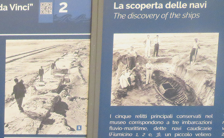 Museo delle Navi di Fiumicino: panels with photos showing the discovery of the wharf (left) and of a "navis vivaria", a fishing boat (right) during the construction of the airport