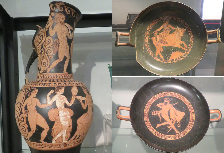 Pottery (Vth-IVth centuries BC): (left) oinochoe or "wine pourer", the jug in which the wine was transferred from the crater to the goblets of the guests; but the term is used generically in reference to any pitcher or ewer; (right) kylixes, wine-drinking cups, with a decoration depicting the Rape of Europa and a satyr