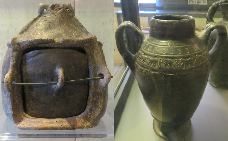 From necropolises near Rieti: (left) cinerary urn (IXth century BC); (right) bucchero vase (VIth century BC)
