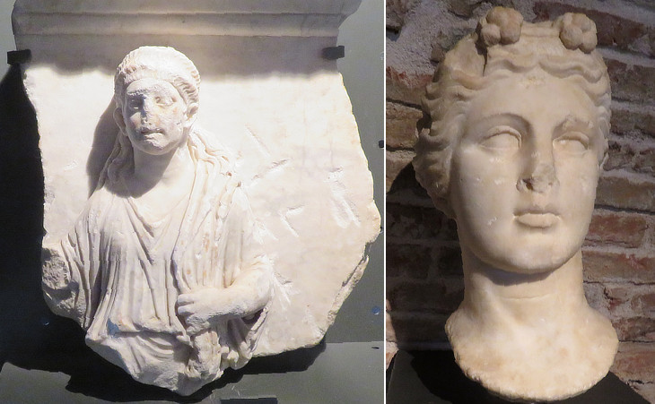 (left) Fragment of relief depicting a "camillus" which was found in the site of the Roman forum of Rieti; (right) head of a statue