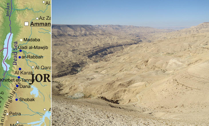 (left) Map showing the locations covered in this page (blue dots); (right) Wadi al-Mawjib (Wady Modjeb)