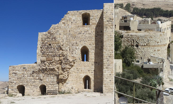 (left) Castle of Kerak: walls of the Crusader (left, darker and more roughly built) and Mameluke (right) periods; (right) one of the defensive towers of the town