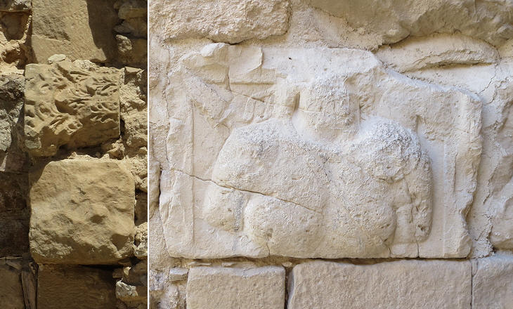 Castle of Kerak: ancient materials utilized in the construction of the castle: (left) a capital; (right) a funerary relief portraying a Nabatean cavalryman