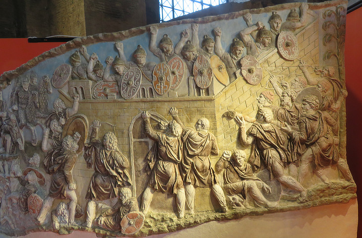 2024 Temporary Exhibition on Dacia: painted cast of a scene of Colonna Traiana: the Dacians lay siege to a Roman fortress south of the Danube River; they are helped by Sarmatian horsemen (see the following scene)