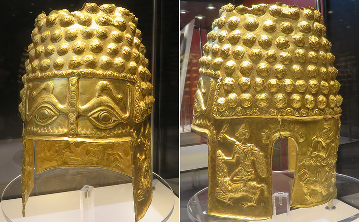 The form of the ceremonial helmet shows a local authentic design and it is assumed it belonged to a Dacian king. It was discovered in 1929 and it is dated Vth century BC, but it is likely that the Romans had seen similar stunning gold ornaments in their deals with the Dacians.