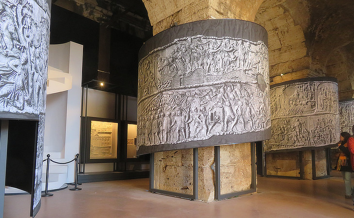Panels of a 2024 temporary exhibition devoted to Colonna Traiana at Colosseo