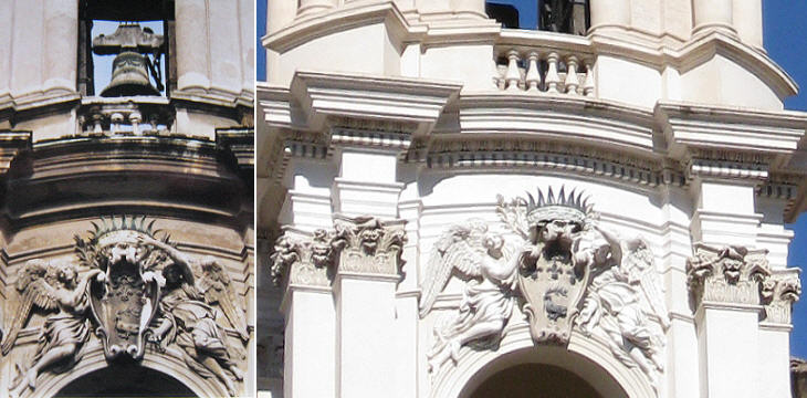 Repainting a historical monument is rarely just a matter of repainting. Very often art historians in charge of supervising the activity discover that in the past the original design was modified and that details were lost: in the bell tower of S. Agnese in Agone the cornice decoration was simplified and the bronze elements of the coat of arms were covered over with paint.