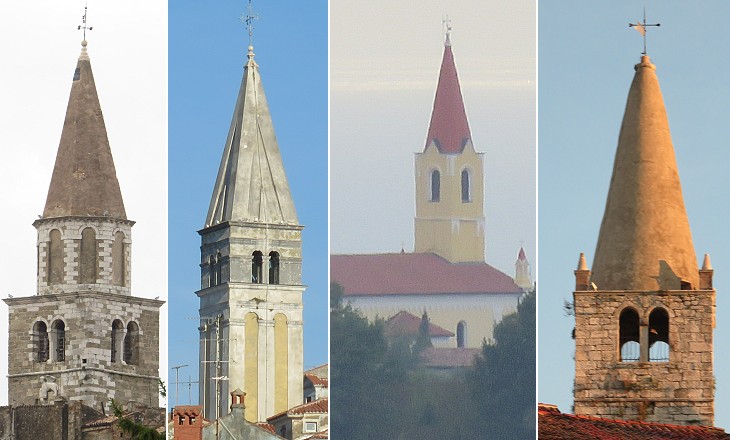 Venetian bell towers at Buie/Buje (2), Verteneglio/Brtonigla and Valle/Bale