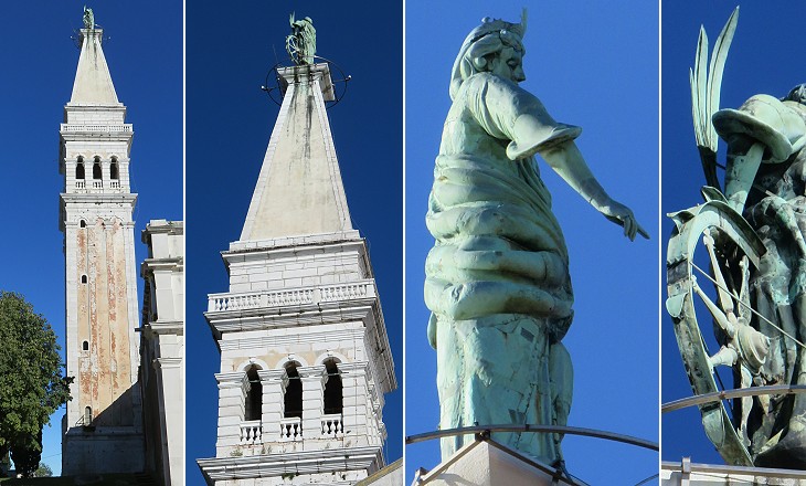 The bell tower was completed in 1758 when a gigantic bronze statue of St. Euphemia was placed at its top. It is similar to those existing at Grado and other towns belonging to the Republic of Venice. Unlike nearby Parenzo, Rovigno did not experience a decrease in population because of pestilences in the XVIIth century and in 1763 the channel which separated the islet from the mainland was filled in order to enlarge the town.