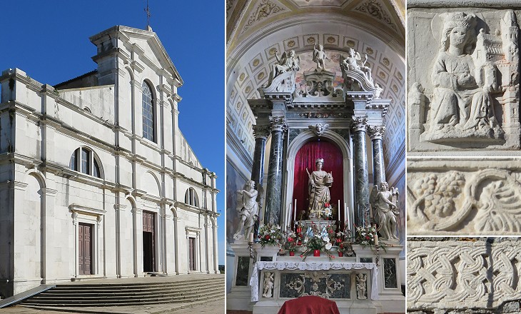 S. Eufemia: (left) façade (completed in 1861); (centre) main altar; (right) reliefs which decorated the old church