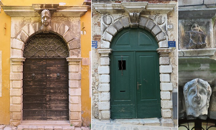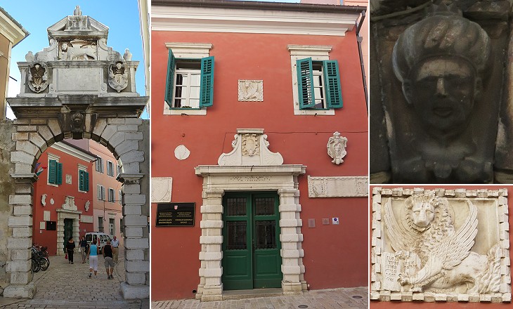 (left) Arco dei Balbi; (centre) Town Hall; (right-above) head of an Ottoman soldier on the gate; (right-below) Winged Lion at the Town Hall. The image used as background for this page shows another detail of the arch: the head of a Venetian soldier