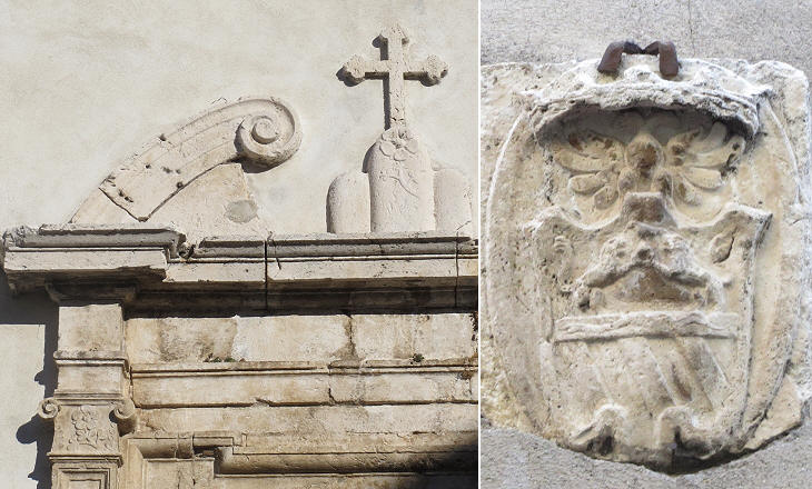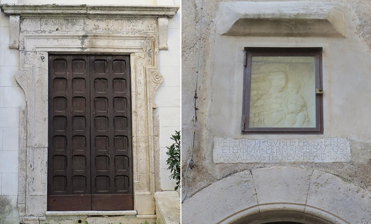 (left) Portal of the parish church with the rose of the Orsini; (right) coat of arms of the Savelli near the parish church