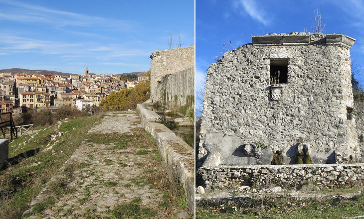 (left) View of Monteflavio (800 m / 2,600 ft) from Fonte Orsini; (right) Fonte Orsini (the image used as background for this page shows the coat of arms)