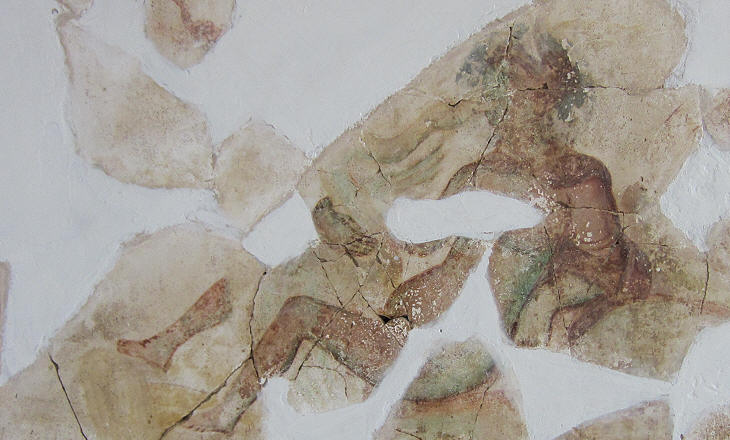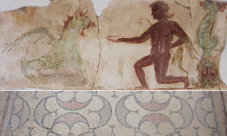 The baths were decorated with coloured mosaics with a variety of geometric patterns; a recurring motif throughout the whole Roman Empire was based on peltae, the shields of the Amazons (you may wish to see a pelta in a relief in the Museum of Corinth or a fountain showing four peltae in Domus Augustana, the imperial palace in Rome).