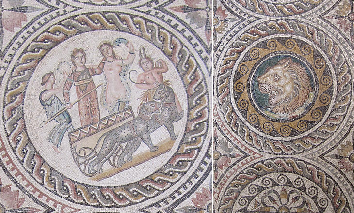 Museum of Sabratha: Mosaic portraying Liber Pater, a local god, as Dionysus and a detail of the decoration which surrounds the main scene (see the same subject in a large mosaic in Tunisia)