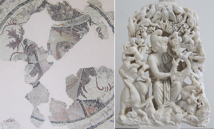 Museum of Sabratha: (left) Fall; (right) Orpheus taming the animals by playing the lyre (see a mosaic in Syria and one in France)