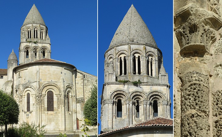 Notre Dame: (left) apse and bell tower; (centre) bell tower (similar to that at Saint-Front); (right) column and capital of the