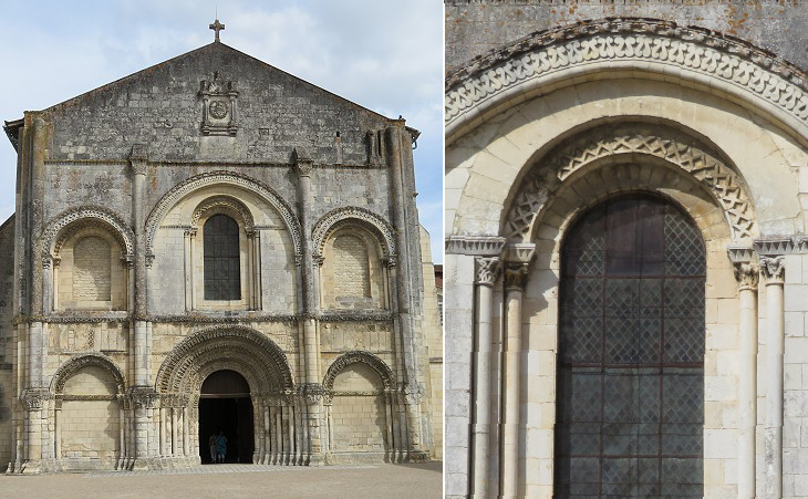 Notre Dame, the church of Abbaye aux Dames: (left) façade; (right) detail of the central window