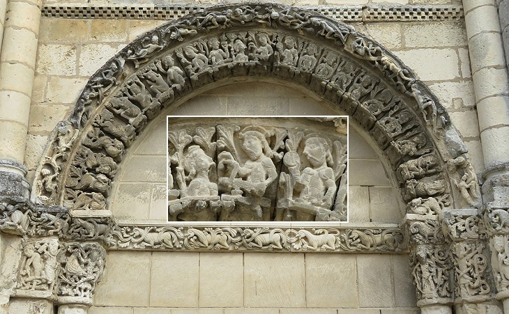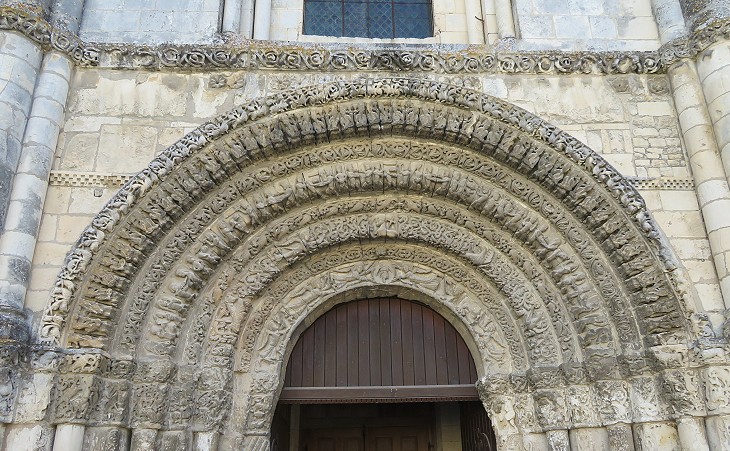 The facade of Ste.-Marie-des-Dames at Saintes dates from two distinct periods. (..) The lower story is obviously more archaic. It seems like (..) influenced by the Moorish ivories (see a Muslim ivory horn) still predominating in the ornament. However, if this church owed much to Spain, it also gave much. We have here one of the earliest examples of voussure sculptures as well as of rows of figures placed parallel to the radii of the portal. The latter motive was taken over by the Spanish sculptors. Porter