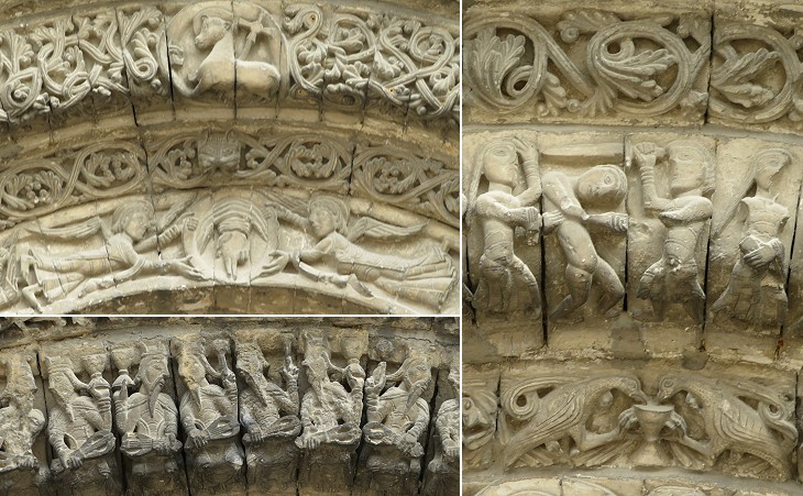 The main portal has a total of eight voussoirs: the four larger ones were decorated with: Elders; the Massacre of the Innocents (but maybe the mass killings of the early martyrs); the Lamb of God and the symbols of the Four Evangelists; angels surrounding the Hand of God. Four narrower voussoirs were decorated with foliage, but some religious symbols can be noticed. The subjects are typical of Romanesque sculpture, but they are rarely depicted in such a crammed manner.