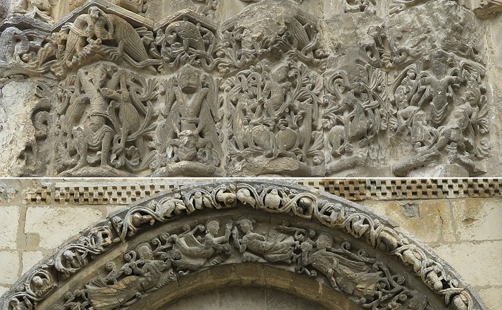Notre Dame: (above) main portal capitals; (below) left portal, most likely depicting the souls of the nuns
