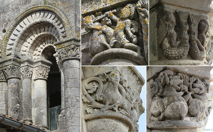 likely decorated the VIth century church; (below-centre) a XVth century decoration and inscription celebrating King Louis XI; (below-right) detail of a capital