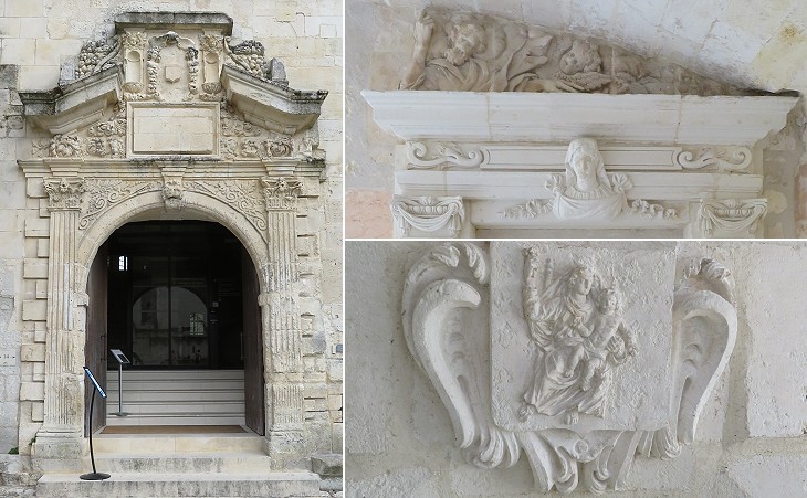 Abbaye aux Dames: (left) XVIIth century portal of the nunnery; (right-above) detail of the former entrance to the Capitular Hall;