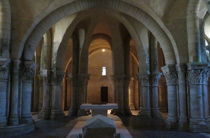 Saint-Eutrope: Romanesque crypt; in the foreground a VIth century sarcophagus bearing the name of Eutropius which was found in 1843