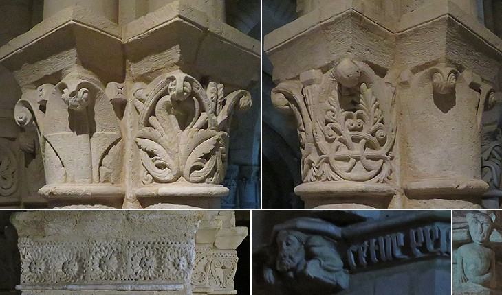 Saint-Eutrope: crypt - details: (above) Romanesque capitals which were restored in the XIXth century; (below-left) a floral relief which most