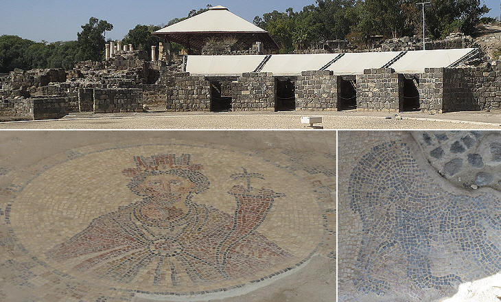 (above) "Sigma" a semicircular square along Palladius Street which perhaps housed a market (see an oval square at Gerasa / Jerash, another town of the "Decapolis"); (below) mosaics inside the rooms portraying Tyche, guardian goddess of the city (left) and a bear (right)