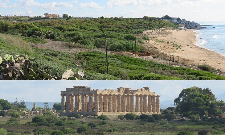 (above) Eastern hill seen from the acropolis with the former harbour of Selinunte in between; (below) enlargement showing the temples