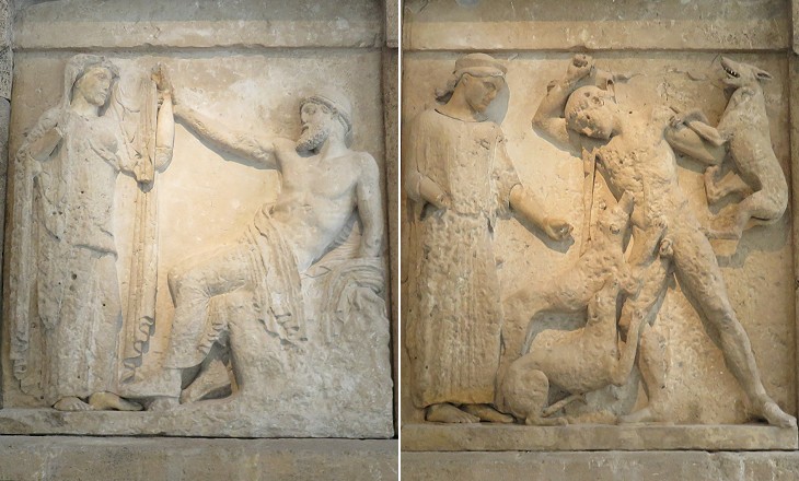 (left) Hera and Zeus; (right) Artemis (Diana) and Actaeon (see the same subject in a cinerary urn at Volterra)
