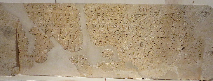 Museo Archeologico Regionale Antonino Salinas di Palermo: votive inscription from Temple G which was studied and translated in 1871; it is known as The Great Table of Selinus and it lists all the gods who were worshipped in the town. It says "The Selinuntines are victorious thanks to the gods Zeus, Phobos, Heracles, Apollo, Poseidon, the Tyndaridae, Athena, Demeter, Pasicrateia and other gods, but especially thanks to Zeus."