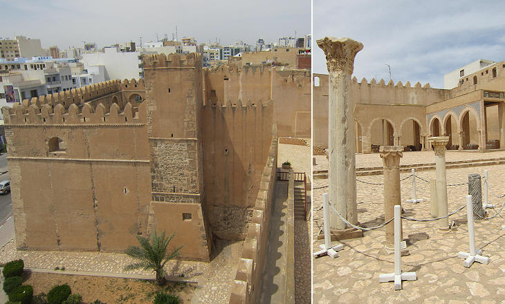 (left) Kasbah seen from its highest tower; (right) ancient columns in the courtyard
